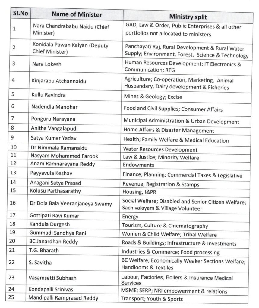 సీఎం చంద్రబాబు సాధారణ పరిపాలన శాఖ, శాంతి భద్రతలు తనవద్దనే ఉంచుకున్నారు. జనసేనాని పవన్ కల్యాణ్ కు పర్యావరణం, అడవులు, సైన్స్ అండ్ టెక్నాలజీ శాఖలు అప్పగించారు. నారా లోకేశ్ కు మానవ వనరులు, ఐటీ, ఎలక్ట్రానిక్స్ అండ్ కమ్యూనికేషన్స్, ఆర్టీజీ శాఖలు అప్పగించారు.