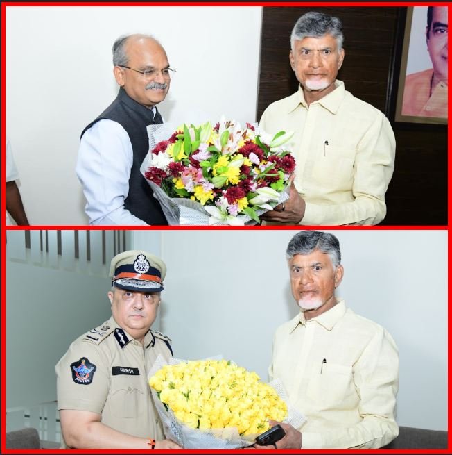 ఉండవల్లి: టీడీపీ అధినేత, కాబోయే ముఖ్యమంత్రి చంద్రబాబు నాయుడును ఉండవల్లిలోని నివాసంలో రాష్ట్ర ప్రభుత్వ ప్రధాన కార్యదర్శి జవహర్రెడ్డి, డీజీపీ హరీష్కుమార్ గుప్తా, మరికొందరు అధికారులు మర్యాదపూర్వకంగా కలిశారు.