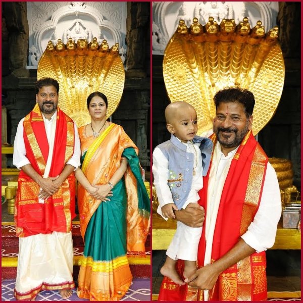 తిరుపతి: తిరుమలలో శ్రీవెంకటేశ్వరస్వామిని తెలంగాణ సీఎం రేవంత్రెడ్డి కుటుంబం దర్శించుకుంది. రేవంత్ తన మనుమడితో కాసేపు సందడి చేశారు. మనుమడి పుట్టు వెంట్రుకల కోసం ఆయన తిరుమల వచ్చారు. పుట్టు వెంట్రుకల కార్యక్రమం పూర్తయిన తర్వాత, రేవంత్ కుటుంబం వైకుంఠం క్యూ ద్వారా వెళ్లి ముడుపులు సమర్పించారు. రెండు రాష్ట్రాల ప్రజలు బాగుండాలని, రెండు రాష్ట్రాలు అభివృద్ధి చెందాలని కోరుకున్నానని రేవంత్ మీడియాకు చెప్పారు. తెలంగాణ నుంచి వచ్చే భక్తుల సౌకర్యం కోసం ఒక సత్రం, కల్యాణమండపం నిర్మించాలని భావిస్తున్నామన్నారు. రాబోయే కొత్త ప్రభుత్వంతో సత్సంబంధాలు ఉండాలని కోరుకున్నానని రేవంత్ చెప్పారు.