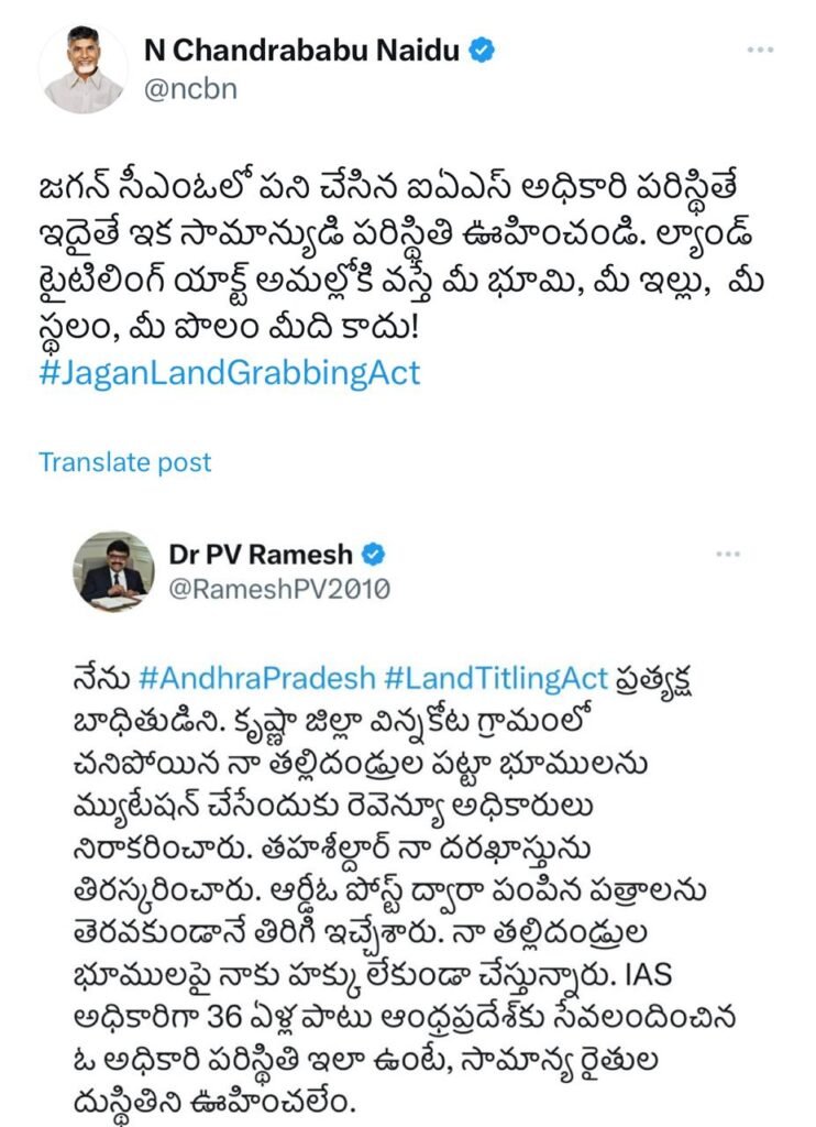 అమరావతి: ల్యాండ్ టైటిలింగ్ యాక్ట్పై రిటైర్డ్ ఐఏఎస్ అధికారి పి.వి.రమేష్ చేసిన ట్వీట్ను టీడీపీ అధినేత నారా చంద్రబాబు నాయుడు రీ ట్వీట్ చేశారు. ల్యాండ్ టైటిలింగ్ యాక్ట్కు తానే ప్రత్యక్ష బాధితుడినంటూ రమేష్ చేసిన ట్వీట్ను వివరించారు. జగన్ సీఎంఓలో పనిచేసిన ఐఏఎస్ అధికారి పరిస్థితే ఇలా ఉంటే..ఇక సామా న్యుడి పరిస్థితి ఊహించండి అంటూ రమేష్ చేసిన ట్వీట్ను షేర్ చేశారు. ల్యాండ్ టైటిలింగ్ యాక్ట్ అమల్లోకి వస్తే మీ భూమి, మీ ఇల్లు, మీ స్థలం, మీ పొలం మీది కాదని స్పష్టం చేశారు.