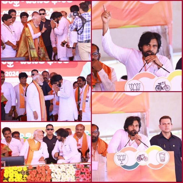 ‘ప్రధాన మంత్రి నరేంద్ర మోదీ  నాయకత్వంలో భారత దేశం మొత్తం అమృత ఘడియలు కొనసాగుతుంటే ఆంధ్రప్రదేశ్ లో వైసీపీ పాలనలో విష ఘడియలు సాగుతున్నాయి. రాష్ట్రంలో ఎటు చూసినా ఇసుక, మట్టి దోపిడీ, స్కాములే కనిపిస్తున్నాయి. ప్రధాన మంత్రి నరేంద్ర మోదీ కూటమిని ముందుండి నడిపిస్తే తప్ప ఈ దోపిడీలు ఆగవు. వికసిత్ భారత్ కలలో ఐదు కోట్ల మంది ఆంధ్రులు నిస్వార్ధంగా మీ వెంట నడుస్తామని చెప్పిన వెంటనే ఆశీస్సులు అందచేసిన మోదీకి యావత్ ఆంధ్ర ప్రజానీకం తరఫున నమస్కారాలు. రాష్ట్రంలో విష ఘడియల్ని అమృత ఘడియల వైపు తీసుకువెళ్ళేందుకు సంసిద్ధులయ్యారు’ అని జనసేన పార్టీ అధ్యక్షులు  పవన్ కళ్యాణ్ తెలియచేసారు. సోమవారం మధ్యాహ్నం రాజమండ్రిలో నిర్వహించిన ఎన్డీఏ కూటమి బహిరంగ సభలో ప్రధాన మంత్రి నరేంద్ర మోదీతో కలసి పాల్గొన్నారు.
