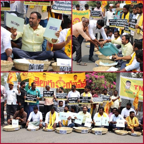 2018 గ్రూప్-1 మెయిన్స్ నోటిఫికేషన్ కు సంబంధించి 2019 లో జరిపిన ప్రిలిమ్స్ 2020 లో జరిపిన మెయిన్స్ పరీక్షల డిజిటల్ మూల్యంకనంలో ఒమర్ షీట్లు మార్చి వైకాపా ప్రభుత్వం ఎపిపిఎస్సిని వైసిపిఎస్సిగా మర్చి 169 పోస్టులు అమ్ముకోవటాన్ని నిరసిస్తూ అక్రమ మార్గంలో భర్తీ అయిన పోస్టులను రద్దు చేస్తూ గౌరవ హైకోర్టు ఇచ్చిన తీర్పును స్వాగతిసస్తూ గుంటూరు జిల్లా తెలుగుయువత అద్యక్షులు రావిపాటి సాయి కృష్ణ ఆధ్వర్యంలో టిఎస్ఎస్ఎఫ్ – నిరుద్యోగులతో కలిసి గుంటూరు జిల్లా కలెక్టర్ కార్యాలయానికి వినూత్న రీతిలో తట్టల్లో గ్రూప్1,2 ఉద్యోగాల నమూనా సీల్డ్ కవర్లను పెట్టుకొని అమ్ముకుంటూ కలెక్టర్ కార్యాలయానికి ప్రదర్శనగా వెళ్లి ప్రధాన ద్వారం ముందు ఉద్యోగాలను అమ్ముతూ నిరసన తెలియజేసారు.