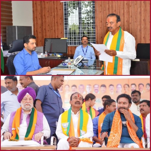 మేడ్చల్ కలెక్టర్ కార్యాలయంలో మల్కాజిగిరి పార్లమెంట్ బిజెపి అభ్యర్థిగా ఈటల రాజేందర్ నామినేషన్ దాఖలు చేశారు. ఈటలతో పాటు మల్కాజిగిరి పార్లమెంట్ బిజెపి ఇంచార్జ్, ఆర్మూర్ ఎమ్మెల్యే రాకేష్ రెడ్డి, కంటోన్మెంట్ బిజెపి అభ్యర్థి వంశీ తిలక్, బీజేపీ రాష్ట్ర ఎస్సీ మోర్చా అధ్యక్షుడు కొప్పు భాషా, బీజేపీ రాష్ట్ర మహిళామోర్చా అధ్యక్షురాలు శిల్పా రెడ్డి పాల్గొన్నారు.