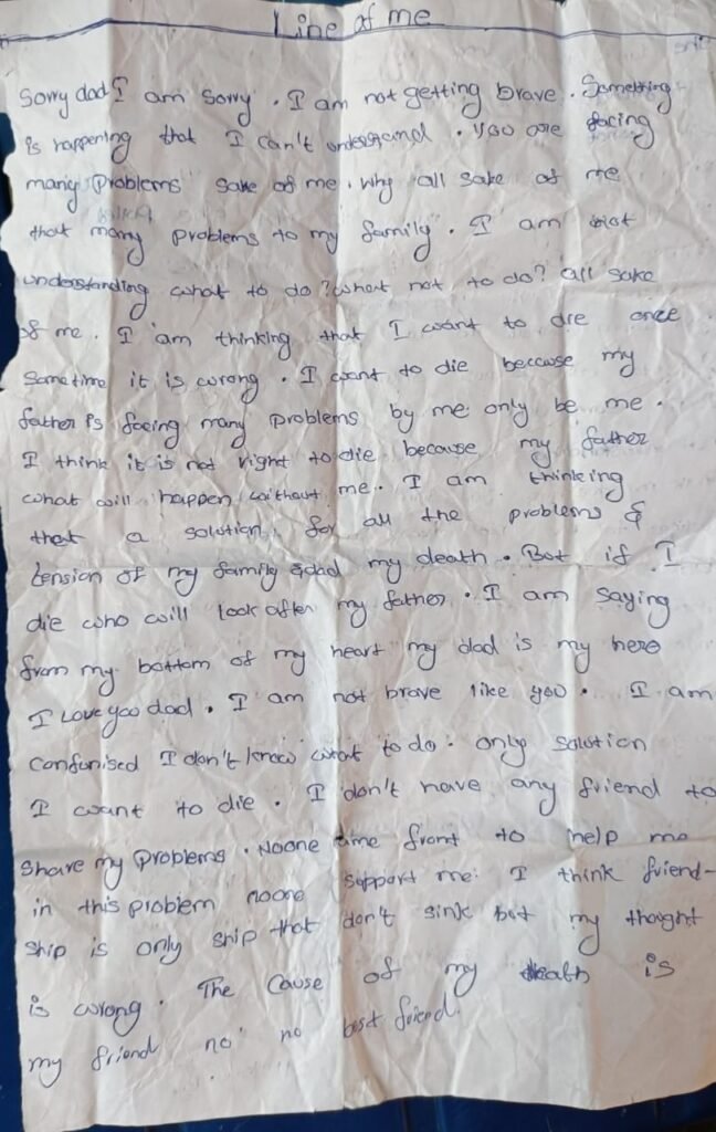 స్కూలు నుండి టిసి ఇచ్చి పంపేసి, వేరే స్కూలులో వేరే సిలబస్ను అర్థం చేసుకోవడం కన్నా.. మీ పాలనలో వచ్చిన ఈ కొత్త పెను విద్యా విప్లవం గురించి అర్థం చేసుకోలేక.. అబ్బ మరియు మా.. కు ఆత్మహత్య లేఖ వ్రాసి, ఉరేసుకొని వ్రేలాడేప్పుడు కూడా.. నా చావు మిమ్మల్ని ఆలోచింపజేస్తుంది అని ఆశించాను ఆఖరి శ్వాస వరకు అంకుల్.