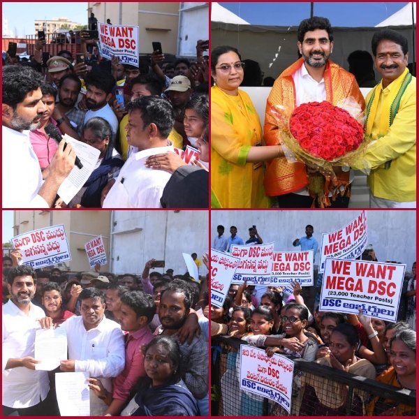 డీఎస్సీ అభ్యర్థుల సమస్యలను సావధానంగా విన్న లోకేష్.. టీడీపీ-జనసేన ప్రభుత్వంలో 20 లక్షల ఉద్యోగాలు కల్పిస్తామని హామీ ఇచ్చారు. గత టీడీపీ ప్రభుత్వంలో రెండు డీఎస్సీలు నిర్వహించి పెద్దఎత్తున ఉపాధ్యాయ పోస్టులను భర్తీచేశామన్నారు. ఏపీపీఎస్సీ ద్వారా క్రమపద్ధతిలో జాబ్ నోటిఫికేషన్ లు విడుదల చేస్తామని హామీ ఇచ్చారు. గత టీడీపీ ప్రభుత్వంలో 6 లక్షల ఉద్యోగాలు కల్పించామని, ఈ విషయాన్ని అసెంబ్లీలో స్వయంగా జగన్ అంగీకరించారని తెలిపారు.