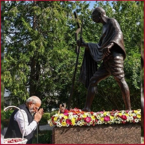 కివ్: ప్రధాని నరేంద్రమోదీ కీవ్లో మహాత్మా గాంధీకి నివాళి అర్పించారు. ఏవీ ఫోమిన్ బొటానికల్ గార్డెన్లో 2020లో నెలకొల్పిన జాతి పిత విగ్రహం వద్ద పుష్పగుచ్ఛం ఉంచి అంజలి ఘటించారు. ఆ తర్వాత ఉక్రెయిన్ అధ్యక్షుడు జెలెన్ స్కీతో కలిసి బాలల స్మారకం, జాతీయ మ్యూజియాన్ని సందర్శించారు. 20, 21వ శతాబ్దాల్లో ఉక్రెయిన్ పౌరులు స్వేచ్ఛ, స్వాతంత్య్రం, సాంస్కృతిక గుర్తింపు కోసం జరిపిన పోరాట చిహ్నాలు అక్కడ ఉన్నాయి.