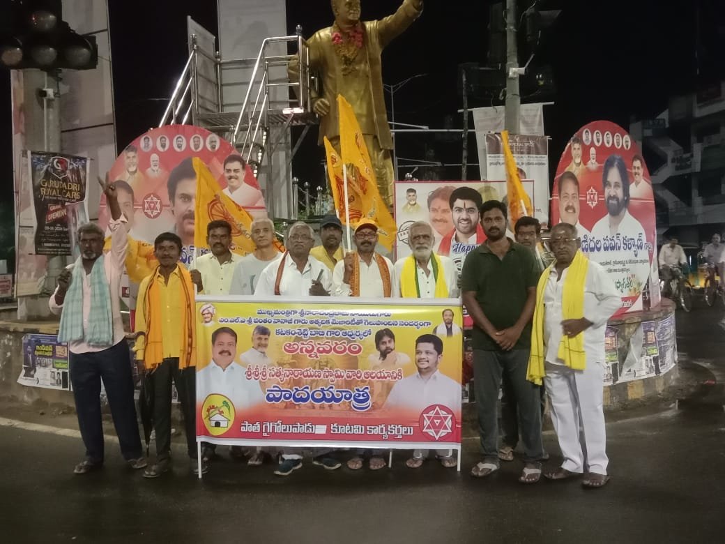 మొక్కుకున్నట్టుగానే వారు గెలుపొందడంతో కాకినాడ రూరల్ కో కోఆర్డినేటర్ కటకంశెట్టి బాబీ ఆధ్వర్యంలో శనివారం పాదయాత్రగా అన్నవరం సత్యనారాయణ స్వామి సన్నిధికి బయల్దేరి మొక్కును తీర్చుకున్నారు.