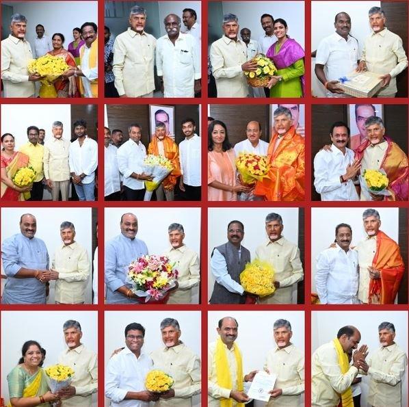 అమరావతి: టీడీపీ అధినేత నారా చంద్రబాబు నాయుడును ఉండవల్లిలోని నివాసంలో గురువారం పలువురు ఎంపీలు, ఎమ్మెల్యేలు, సీనియర్ నేతలు మర్యాదపూర్వకంగా కలిశారు. ఎన్నికల్లో ఘన విజయం సాధించిన ఎంపీ, ఎమ్మెల్యేలను చంద్రబాబు ఈ సందర్భంగా అభినందించారు. ఫలితాలు వెలువ డిన అనంతరం రెండో రోజూ కూడా నేతలు, కార్యకర్తల రాకతో చంద్రబాబు నాయుడు నివాసం దగ్గర సందడి వాతావరణం నెలకొంది.