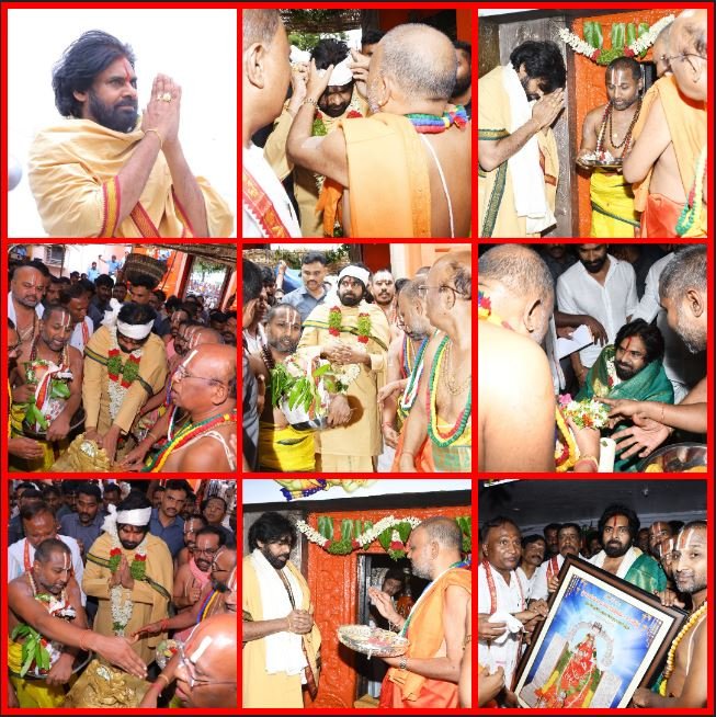 ప్రధాన స్థానాచార్యులు కపీంద్ర స్వామి పవన్ కళ్యాణ్ కి సంప్రదాయబద్దంగా తలపాగ చుట్టి ఆలయంలోకి ఆహ్వానించారు. అనంతరం శ్రీ ఆంజనేయస్వామి వారికి ప్రత్యేక పూజలు నిర్వహించారు. ఆంజనేయస్వామికి ఇరు వైపులా ఉన్న శ్రీ వెంకటేశ్వరస్వామి, శ్రీ లక్ష్మీ అమ్మవార్లకు అర్చనలు చేసిన అనంతరం ఆలయ అర్చకులు వేదాశీర్వచనాలు అందించి, స్వామి వారి ప్రసాదం అందచేశారు.