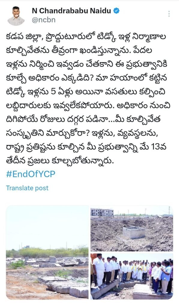 కడప జిల్లా, ప్రొద్దుటూరులో టిడ్కో ఇళ్ల నిర్మాణాల కూల్చివేతను తీవ్రంగా ఖండిస్తున్నాను. పేదల ఇళ్లను నిర్మించి ఇవ్వడం చేతకాని ఈ ప్రభుత్వానికి కూల్చే అధికారం ఎక్కడిది? మా హయాంలో కట్టిన టిడ్కో ఇళ్లను 5 ఏళ్లు అయినా వసతులు కల్పించి లబ్దిదారులకు ఇవ్వలేకపోయారు. అధికారం నుంచి దిగిపోయే రోజులు దగ్గర పడినా…మీ కూల్చివేత సంస్కృతిని మార్చుకోరా? ఇళ్లను, వ్యవస్థలను, రాష్ట్ర ప్రతిష్టను కూల్చిన మీ ప్రభుత్వాన్ని మే 13వ తేదీన ప్రజలు కూల్చబోతున్నారు.