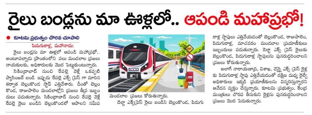 పిడుగురాళ్ల, మహానాడు: రైలు బండ్లను మా ఊళ్లలో ఆపండి మహాప్రభో! అంటూ ప్రజలు ఎదుర్కొంటున్న ఇబ్బందులపై ‘మహానాడు’ పత్రికలో ప్రచురితమైన కథనానికి స్పందన లభించింది. దీనిపై గురజాల శాసనసభ్యులు యరపతినేని శ్రీనివాసరావు రైల్వే ఉన్నతాధికారులతో మాట్లాడి, రైళ్లు ఆయా స్టేషన్లలో నిలిచేలా కృషి చేశారు.