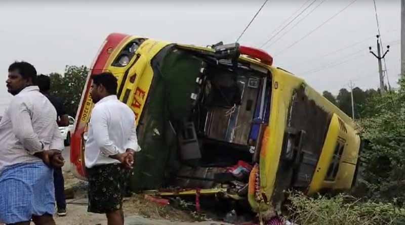 చిలకలూరిపేట : పల్నాడు జిల్లాలో ట్రావెల్స్ బస్సు బోల్తా కొట్టింది. ఈ ప్రమాదంలో 20 మందికి తీవ్ర గాయాలు అయ్యాయి. ఈ సంఘటన శనివారం ఉదయం చోటు చేసుకుంది. ఈ సంఘటన వివరాలు ఇలా ఉన్నాయి. చిలకలూరిపేట మండలం లింగంగుంట్ల వద్ద కామాక్షి ట్రావెల్స్ బస్సు బోల్తా కొట్టింది. కామాక్షి ట్రావెల్స్ బస్సు బోల్తా కొట్టిన తరుణంలోనే… బస్సులో ఉన్న 20 మందికి గాయాలు కాగా, ఇద్దరు పరిస్థితి విషమంగా ఉందని పోలీసులు గుర్తించారు. ఈ సంఘటన జరిగిన వెంటనే పోలీసులు.. అక్కడి కి చేరుకుని దర్యాప్తు చేస్తున్నారు. హైదరాబాదు నుంచి ఒంగోలు కందుకూరు వెళ్తున్న సమయంలోనే కామాక్షి ట్రావెల్స్ బస్సు బోల్తా కొట్టింది.