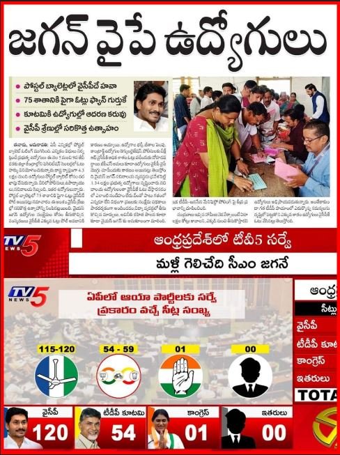 ఇంతకూ విషయమేమిటంటే.. వైసీపీని తీవ్ర ంగా వ్యతిరేకించే ఈనాడు దినపత్రిక, టీవీ 5 చానెళ్లు, ఎన్నికల్లో వైసీపీ గెలవబోతోందని.. ప్రభుత్వ ఉద్యోగులంతా వైసీపీకే ఓటు వేయాలని నిర్ణయించుకున్నారట. ఆ మేరకు ఈనాడు పేరిట ఒక వార్తా కథనం, టీవీ 5లో ఒక స్క్రీన్షాట్ సోషల్మీడియాలో వదిలారు. అదో శునకానందం!