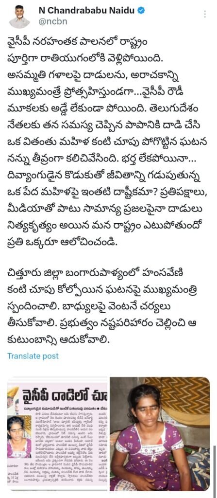 – చిత్తూరులో వైసీపీ మూక దాడిలో వితంతు మహిళ కంటిచూపు కోల్పోయిన ఘటనపై చంద్రబాబు ఆవేదన