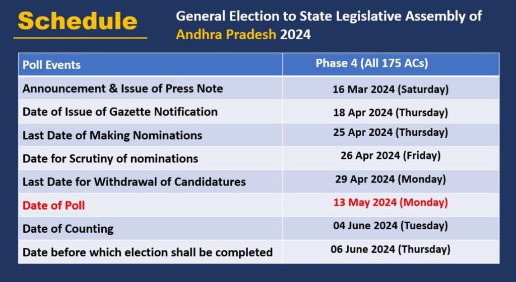 ఇక ఆంధ్రప్రదేశ్లోని 175 అసెంబ్లీ సీట్లకు, 25 లోక్ సభ స్థానాలకు ఒకే విడతలో ఎన్నికలు నిర్వహించనున్నటు పేర్కొంది. ఈ ఎన్నికలను ఏడు దశల్లో నిర్వహించనుండగా, ఏపీలో ఎన్నికలు నాల్గో విడతలో నిర్వహించనున్నట్లు సీఈసీ తెలిసింది. ఆంధ్రప్రదేశ్లో మే 13వ తేదీన ఎన్నికలు నిర్వహించనున్నట్లు ఎన్నికల సంఘం తెలిపింది. అదే సమయంలో జూన్ 4వ తేదీన కౌంటింగ్ ఉంటుందని సీఈసీ తెలిపింది.