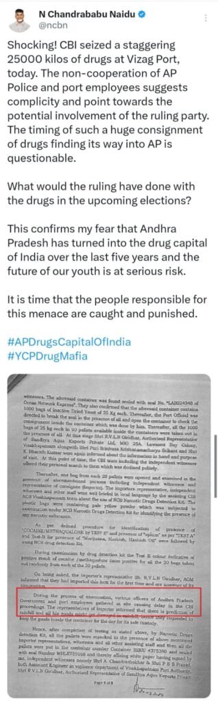 విశాఖ పోర్టులో 25 వేల కిలోల డ్రగ్స్ స్వాధీనంపై విస్మయం వ్యక్తం చేసిన చంద్రబాబు.విశాఖ పోర్టులో సిబిఐ 25000 కిలోల డ్రగ్స్ని సీబీఐ స్వాధీనం చేసుకోవడం షాక్ కు గురిచేసింది.డ్రగ్స్ స్వాధీనంలో ఎపి పోలీసులు, పోర్టు అధికారులు సహకరించకపోవడం చూస్తుంటే ఈ వ్యవహారంలో అధికార పక్షం హస్తం కనిపిస్తుంది.ఇంత భారీ స్థాయిలో డ్రగ్స్ రాష్ట్రంలోకి రావడంపై విచారణ జరగాలి.వచ్చే ఎన్నిక కోసమే వైసీపీ అధిష్టానం డ్రగ్స్ ను తెచ్చినట్లు తెలుస్తోంది.గత ఐదేళ్లలో ఆంధ్రప్రదేశ్ డ్రగ్స్ క్యాపిటల్గా మారిపోయింది.మన యువత భవిష్యత్తు తీవ్ర ప్రమాదంలో పడింది. ఈ సమస్యకు కారణమైన వారిని కఠినంగా శిక్షించాలి.
